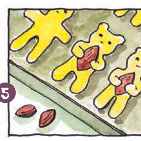 Benjamins Rezept: Mandelbärchen Lege eine Mandel auf den Bauch und drücke vorsichtig die Arme darüber fest.Zurück Weiter