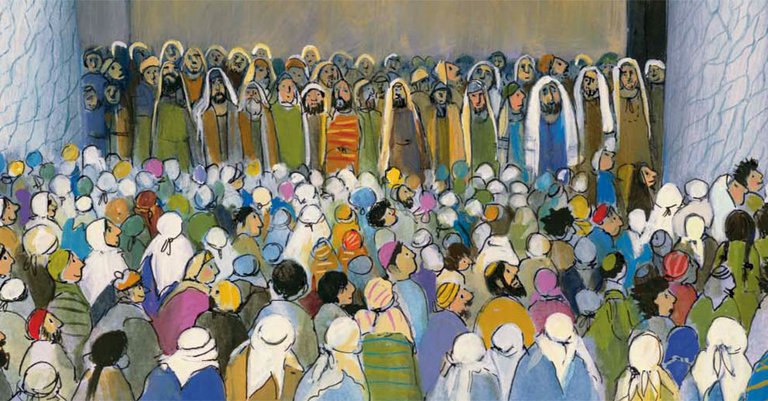 Und mit einem Mal konnten alle in unterschiedlichen Sprachen sprechen. Viele Menschen strömten herbei, weil sie das Rauschen und Reden hörten. Und alle waren erstaunt. Denn jeder konnte die Jünger in seiner eigenen Sprache verstehen. ,,Was ist denn hier los?“, fragte einer. ,,Die sind bestimmt betrunken!“, meinte ein anderer.